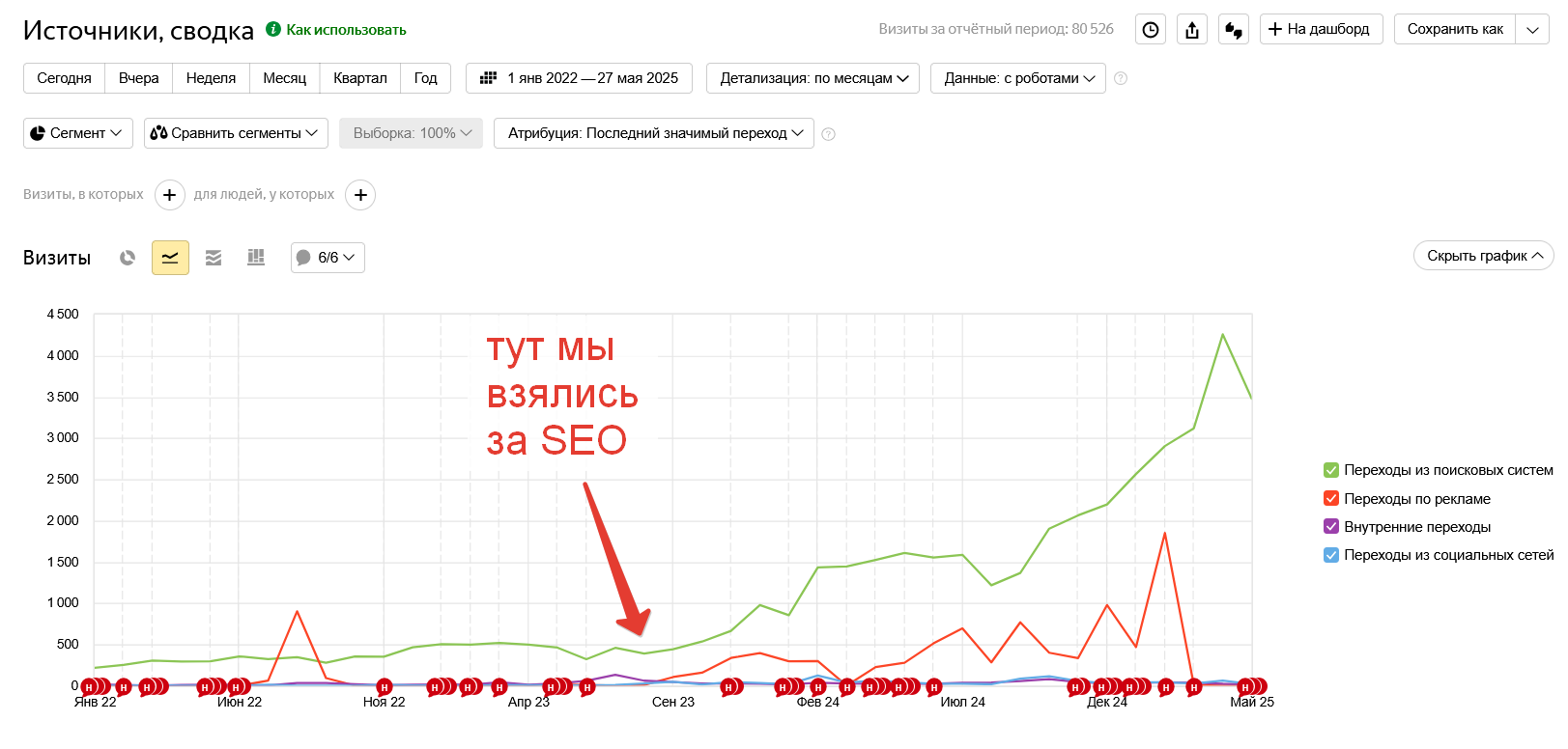 Это скрин статы из метрики по источникам трафика за достаточно длительный промежуток времени. Взялись мы за SEO в августе 2023 года. Сейчас у нас на дворе июнь 2025. То есть прошло практически два года. На графике вы видите чуть больший промежуток времени.