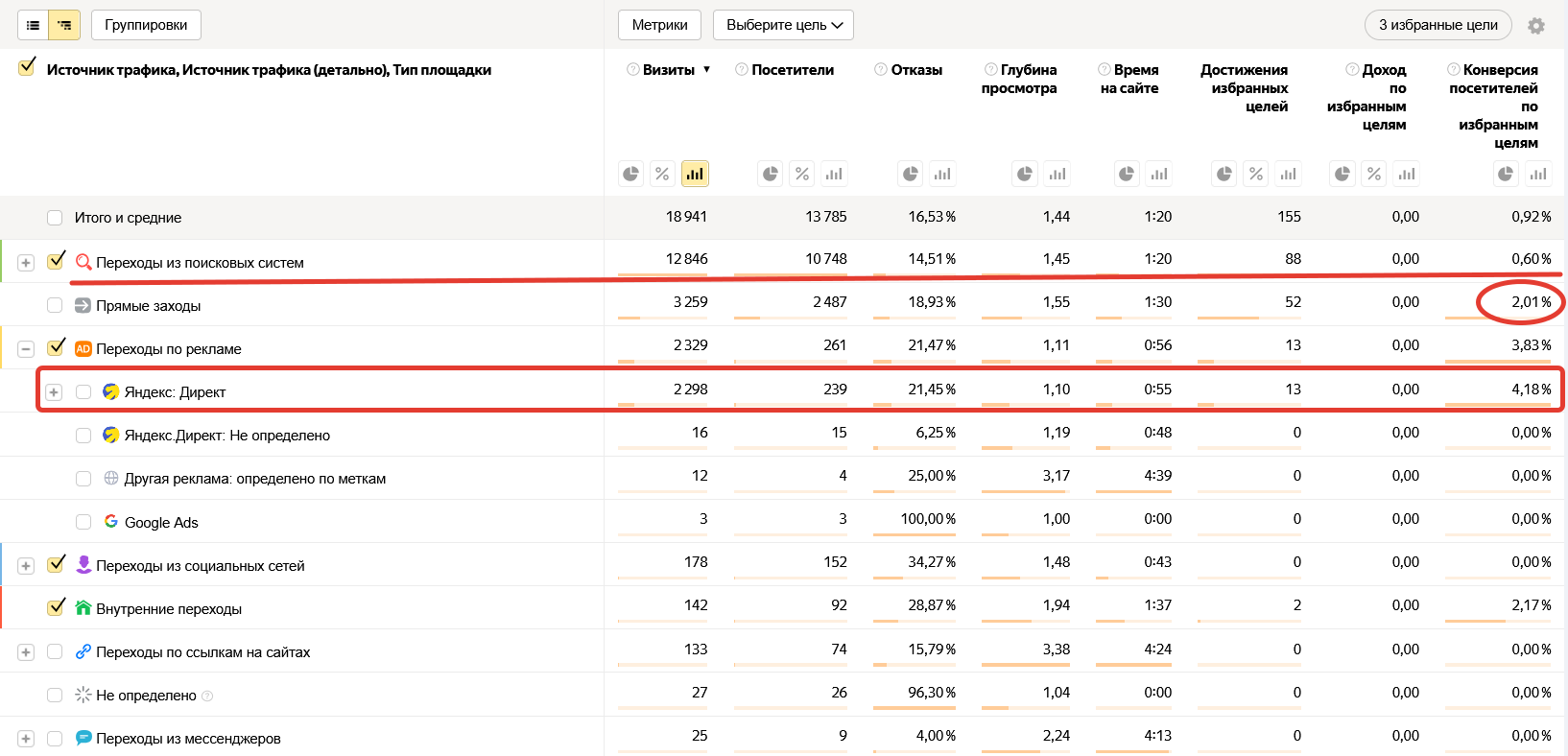 И если посмотреть на таблицу по тем же источникам трафика и по конверсиям, то мы можем увидеть, что конверсия из Яндекс.Директ была выше 4%.