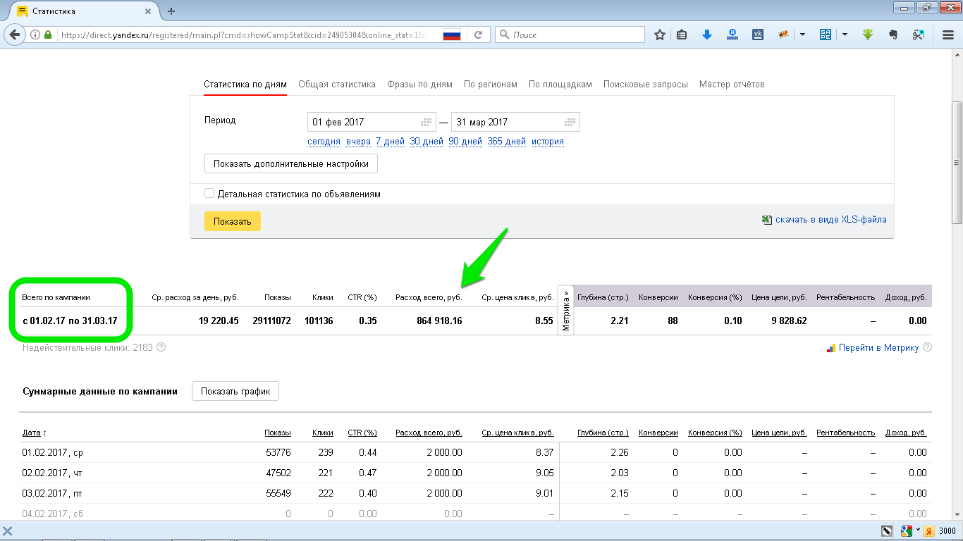 Сразу вспоминается мой кейс со сверхнизкочастотными запросами, в котором я сказал, что одноцентовые кампании уже канули в лету. Но на самом деле при грамотной настройке и ведении, как видите, все-таки еще можно получать клики в районе 1.7 цента, и довольно много и долго. По среднечастотным запросам.