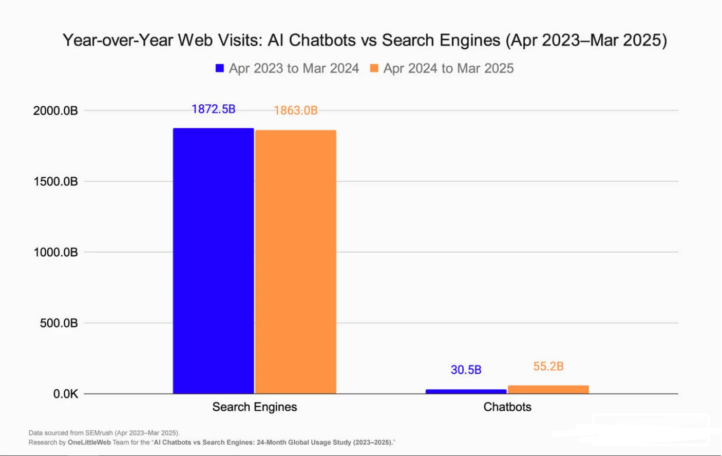 Сравнение здесь приведено за два года, с апреля по март 23-24 гг и потом тоже с апреля по март 24-25 гг. И как вы можете видеть, на сегодняшний день, конечно, поисковые системы намного опережают по числу запросов те самые нейросети. Но, тем не менее, вы можете оценить, что число запросов к нейросетям очень быстро растет. И, скорее всего, этот тренд будет сохраняться и в будущем. Поэтому серьезным бизнесом, серьезным сайтам, на самом деле, к этому нужно готовиться уже сейчас.