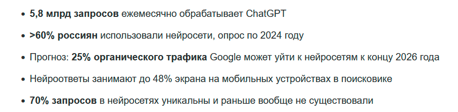 Оценка перехода 25% поискового трафика к нейросетям к концу 2026 года, конечно, является условной и далеко не факт, что будет именно так. Но, тем не менее, это вполне возможно.